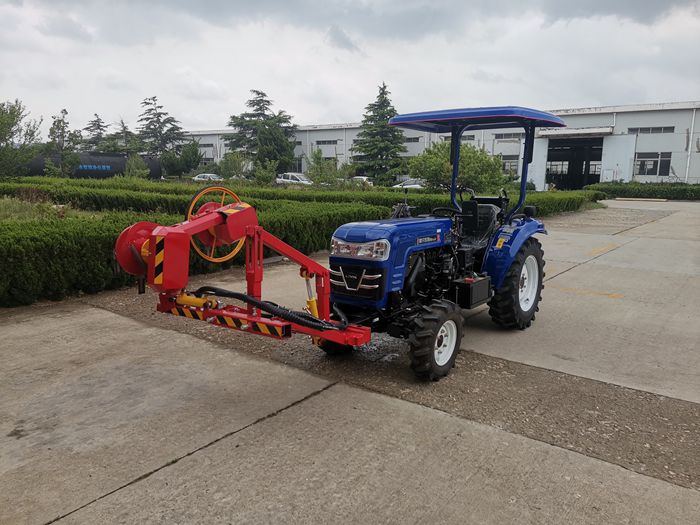 The obstacle avoidance mower under fruit trees is a fully hydraulic drive mower with simple structure and convenient operation, which is developed by Zhongyi Company to solve the problem of the lack of corresponding equipment for mowing under fruit trees in modern orchards. All movements of the machine are hydraulically driven and controlled. The operator can flexibly adjust the cutting angle and cutter head height according to different working conditions and landforms; The obstacle avoidance mechanism adopts a spring mechanism with adjustable tension force+a roller mechanism, which is simple in structure and not easy to be damaged; Two groups of 8 flail knives are used for the cutter part, which has high cutting efficiency and is not easy to wrap grass; The mower is installed in front of the tractor, which is convenient for the operator to observe the working conditions ahead and flexibly adjust the state of the mower.