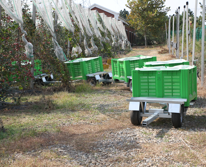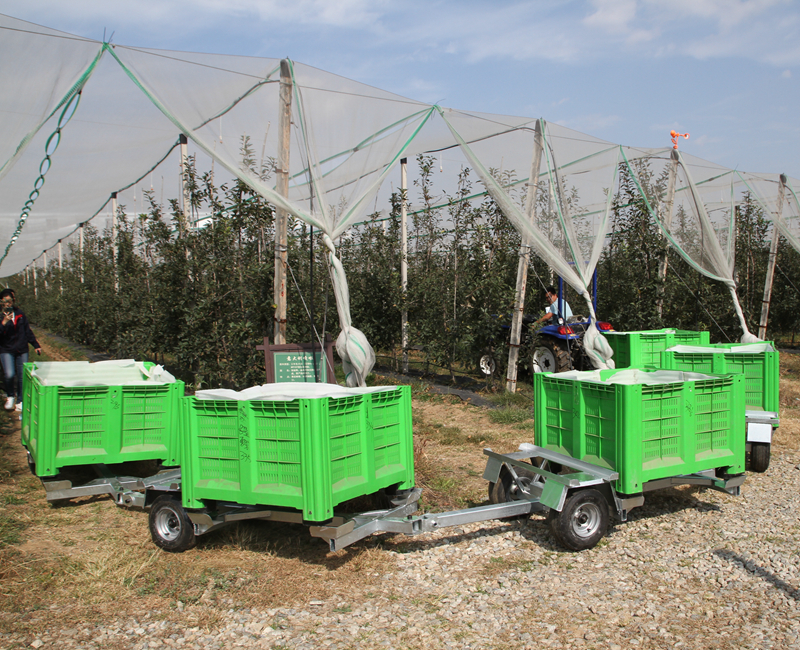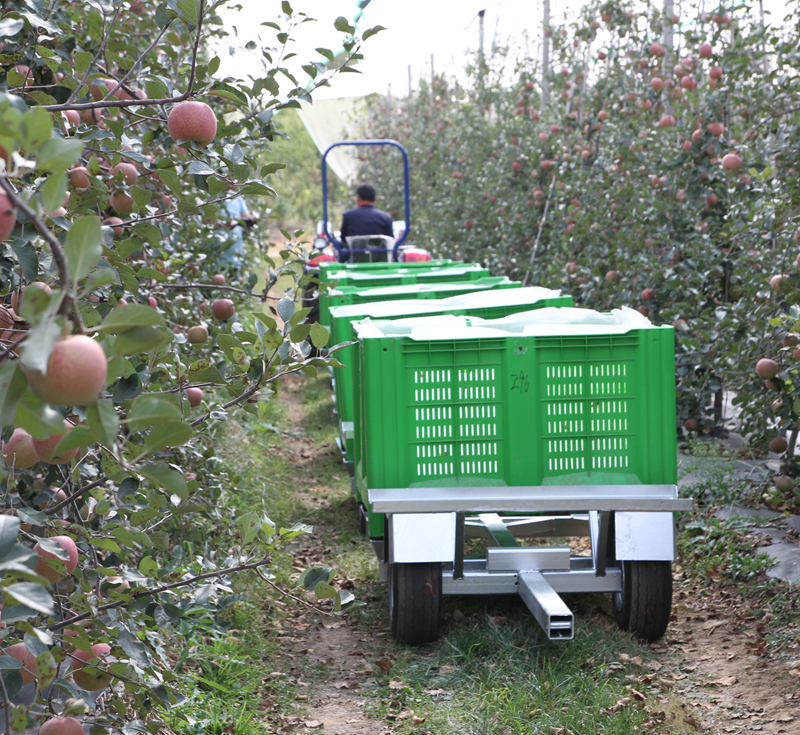 The picking train is a special equipment designed by our company to improve the picking and transportation turnover efficiency of modern orchards and greatly reduce fruit bruises. Train structure design is simple and firm; The whole vehicle adopts hot-dip zinc surface treatment process, which is durable; Four sets of adjusted damping devices for fruit baskets are set at the place where fruit baskets are placed. Compared with traditional transport vehicles, they can greatly reduce the damage rate during fruit transportation and improve the economic benefits, which can be described as "small investment and large income". The wide body tire of golf cart is adopted for the train, which can effectively reduce the bumpiness of the pitted road facing the fruit. Each 4-6 trains are in a formation. Each group of trains is equipped with one tractor traction support and one storage support for easy use and storage.